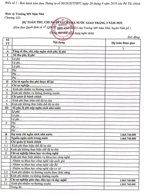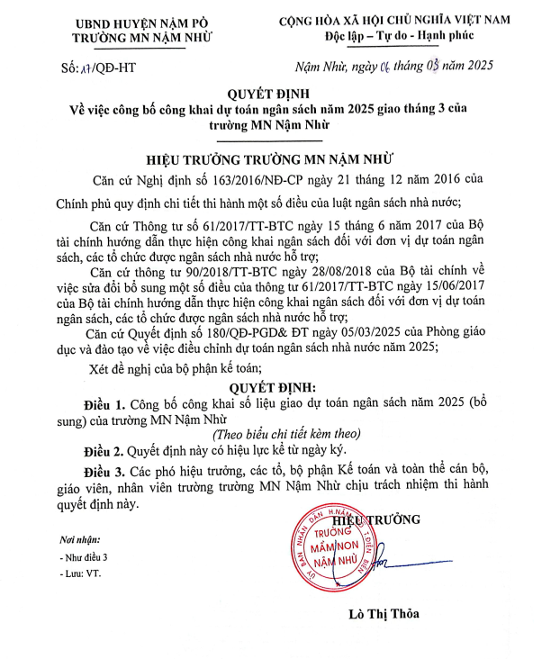 Biên bản về việc công khai giao dự toán NSNN bổ sung năm 2025, quyết định về việc công bố công khai dự toán ngân sách năm 2025 giao tháng 3 của trường mầm non nậm Nhừ