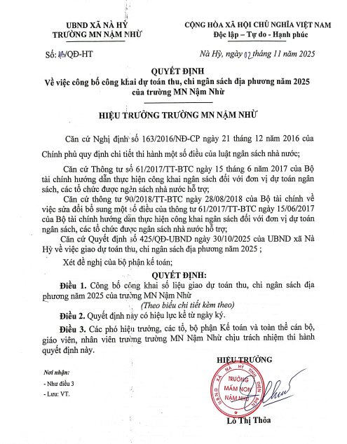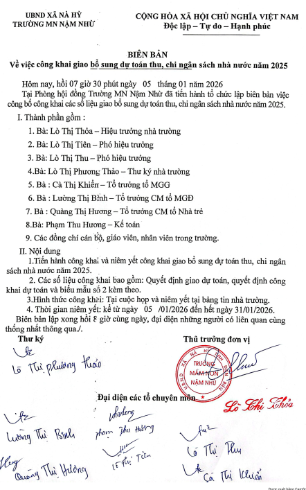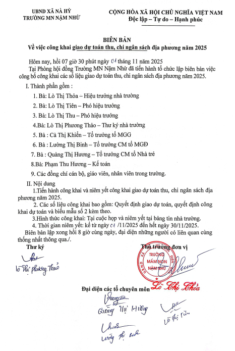Biên bản về việc công khai giao dự toán thu, chi ngân sách địa phương năm 2025, Quyết định về việc công bố công khai dự toán thu, chi ngân sách địa phương năm 2025 của trường Mầm non Nậm Nhừ