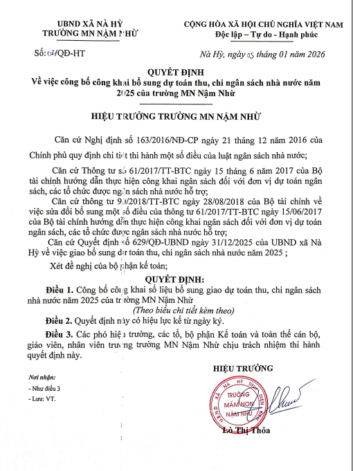 Quyết định về việc công bố công khai bổ sung dự toán thu, chi ngân sách nhà nước năm 2025 của trường mầm non nậm nhừ