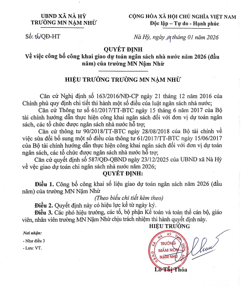 Quyết định về việc công bố công khai giao dự toán ngân sách nhà nước năm 2026( đầu năm) của trường mầm non Nậm Nhừ