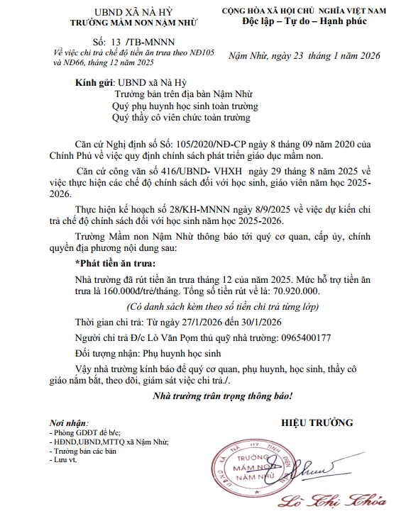 Thông báo Về việc chi trả chế độ tiền ăn trưa theo NĐ105 và NĐ66, tháng 12 năm 2025